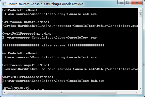 原本以为这是一个非常简单的 CASE,直接用 GetModuleFileName 不就行了吗?结果还真不如我所想。无论程序运行过程中被改名成什么样子,GetModuleFileName 返回的都是 EXE 开始运行时的名字。然后又尝试了 GetProcessImageFileName,也是如此,直到最后找到了 QueryFullProcessImageName。