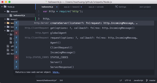 - atom-ternjs 用于 Javascript 和 Node.js 的自动补全