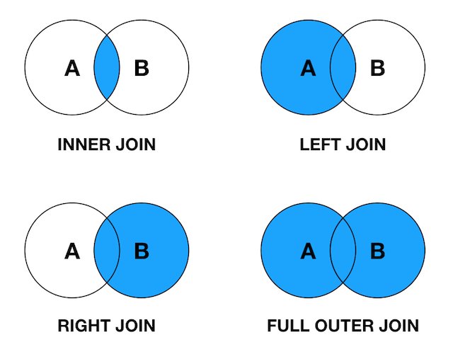 以上四种,就是 SQL 里常见 JOIN 的种类和概念了,看一下它们的合影:
