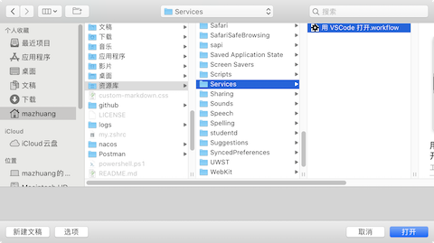 如果找不到这个操作,可以「文件」-「打开」-个人目录 / 资源库 / Services / 用 VSCode 打开.workflow