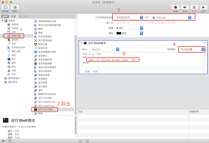 以上代码片段的大概意思是对于传入的一个或多个参数,都使用 Visual Studio Code 这个 APP 打开(将以下步骤配置完成后,可以分别选中一个、多个文件 / 文件夹,然后右键用 VSCode 打开看看效果)。