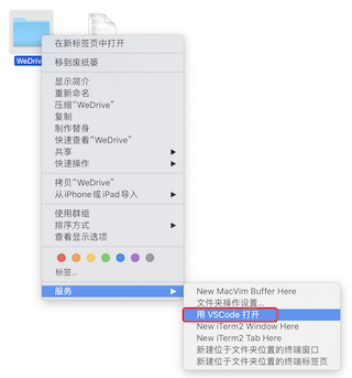 好了,现在试试在 Finder 里右键一个文件,就可以直接看到「用 VSCode 打开」菜单,右键一个文件夹,就可以看到「服务」-「用 VSCode 打开」菜单了。
