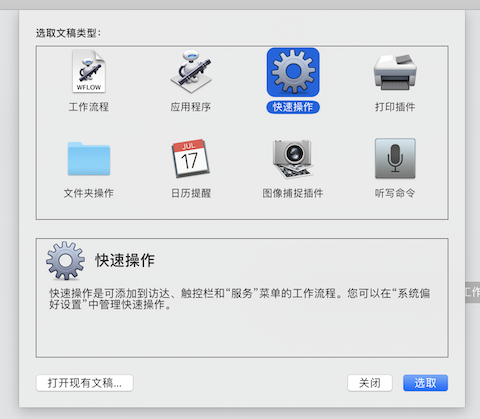 command + n 新建文稿,在「选取文稿类型」里选择「快速操作」;